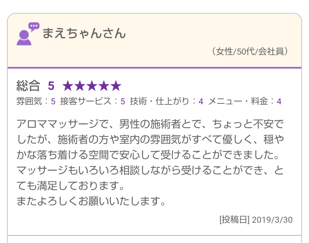アロママッサージで、男性の施術者とで、ちょっと不安でしたが、施術者の方や室内の雰囲気がすべて優しく、穏やかな落ち着ける空間で安心して受けることができました。
