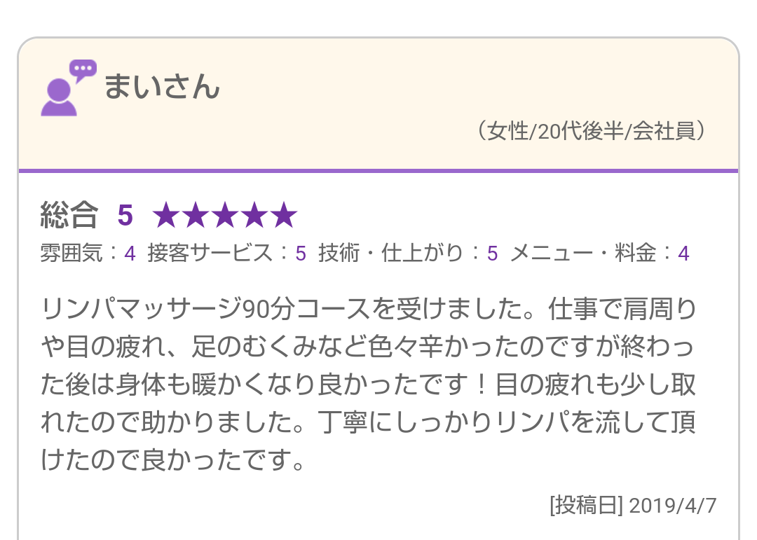 リンパマッサージ90分コースを受けました。