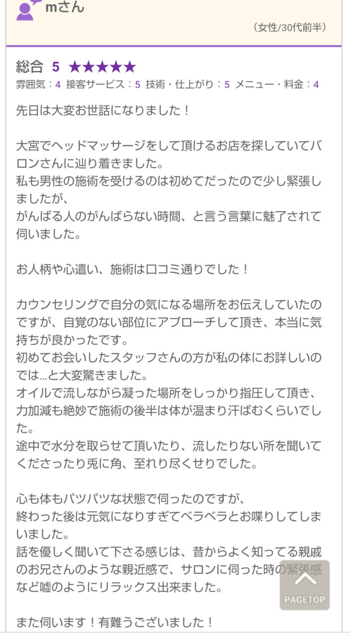 大宮でヘッドマッサージをして頂けるお店を探していてバロンさんに辿り着きました。