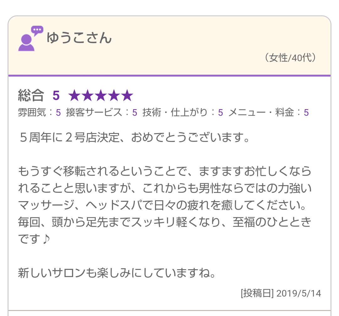 もうすぐ移転されるということで、ますますお忙しくなられることと思いますが、これからも男性ならではの力強いマッサージ、ヘッドスパで日々の疲れを癒してください。