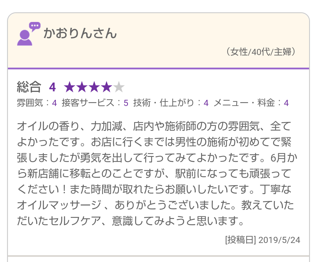 お店に行くまでは男性の施術が初めてで緊張しましたが勇気を出して行ってみてよかったです。