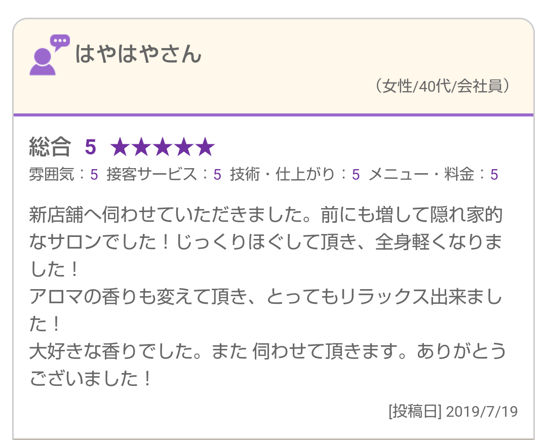 アロマリンパマッサージを受けて頂いたお客様の口コミを紹介させて頂きます(^^)