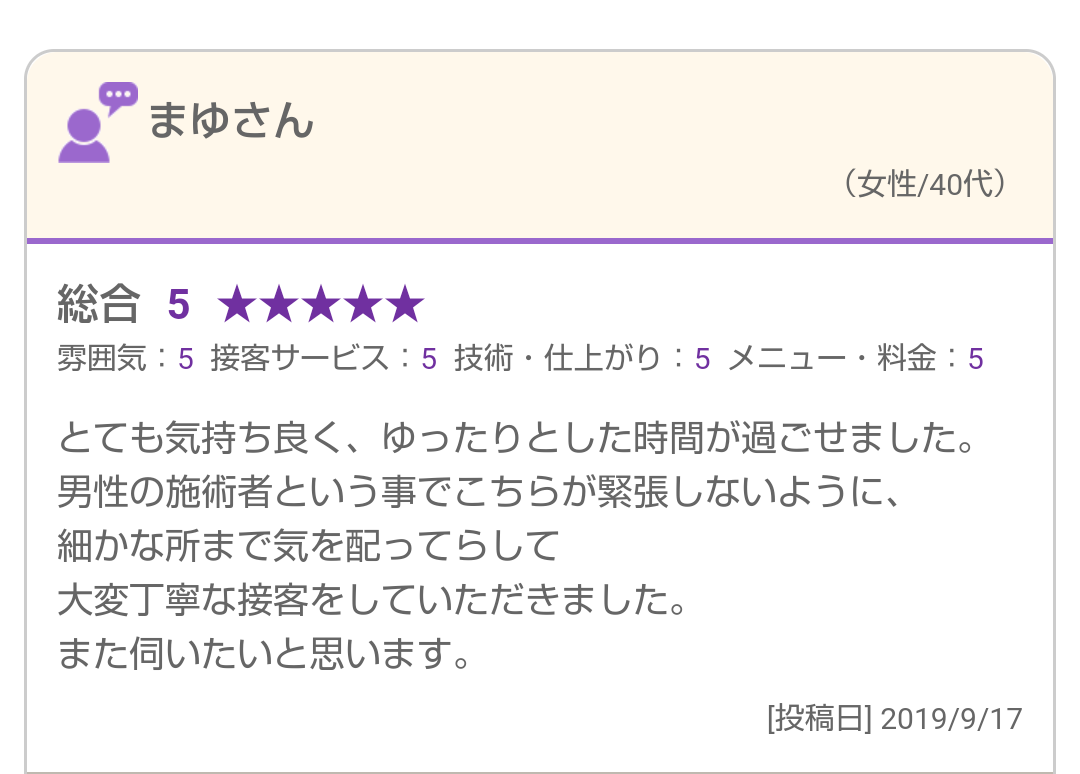 施術も合ったようで、ゆったりとお過ごし頂けたようでよかったです。