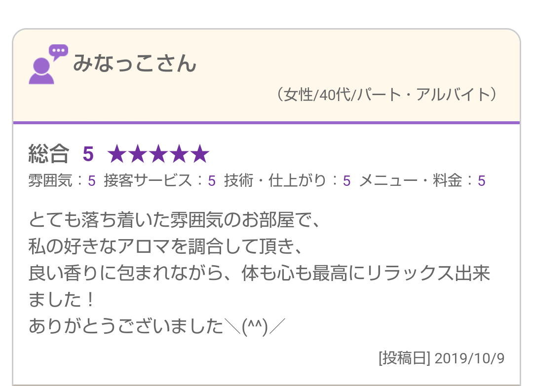 サロンの雰囲気やアロマの調合もお気に召したようで、体も心もリラックスして頂けたようでよかったです!