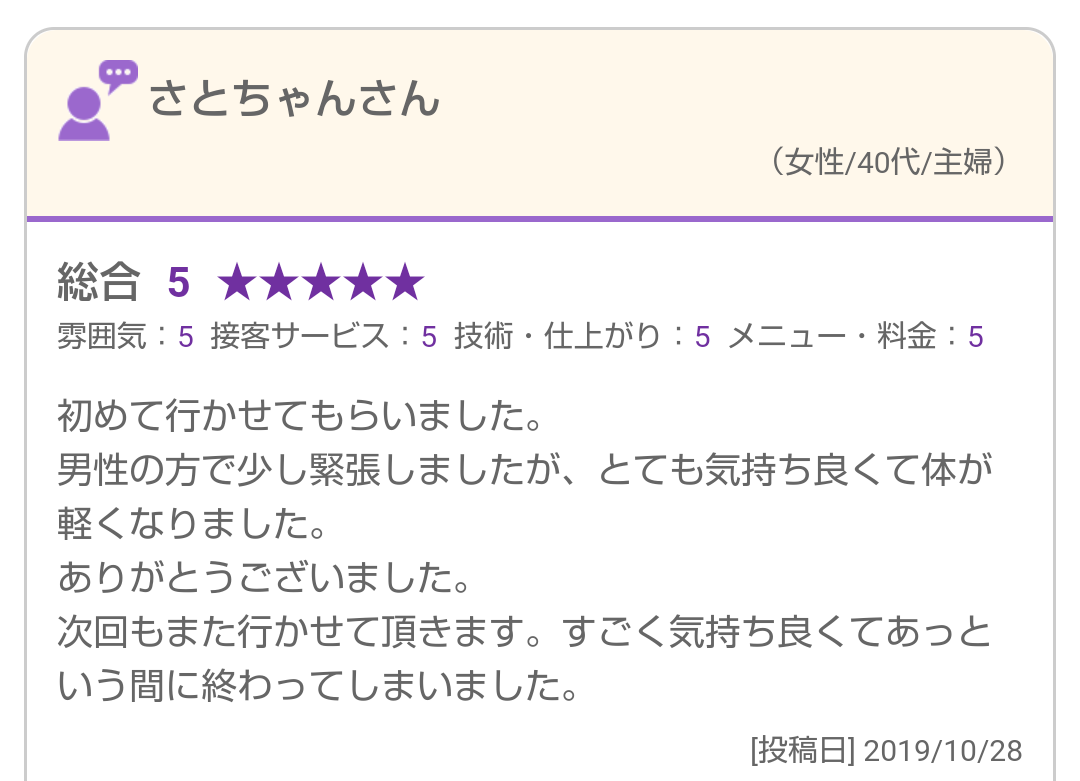 施術も最高に気持ちよく、コリもほぐして頂きすごく身体が楽になりました。