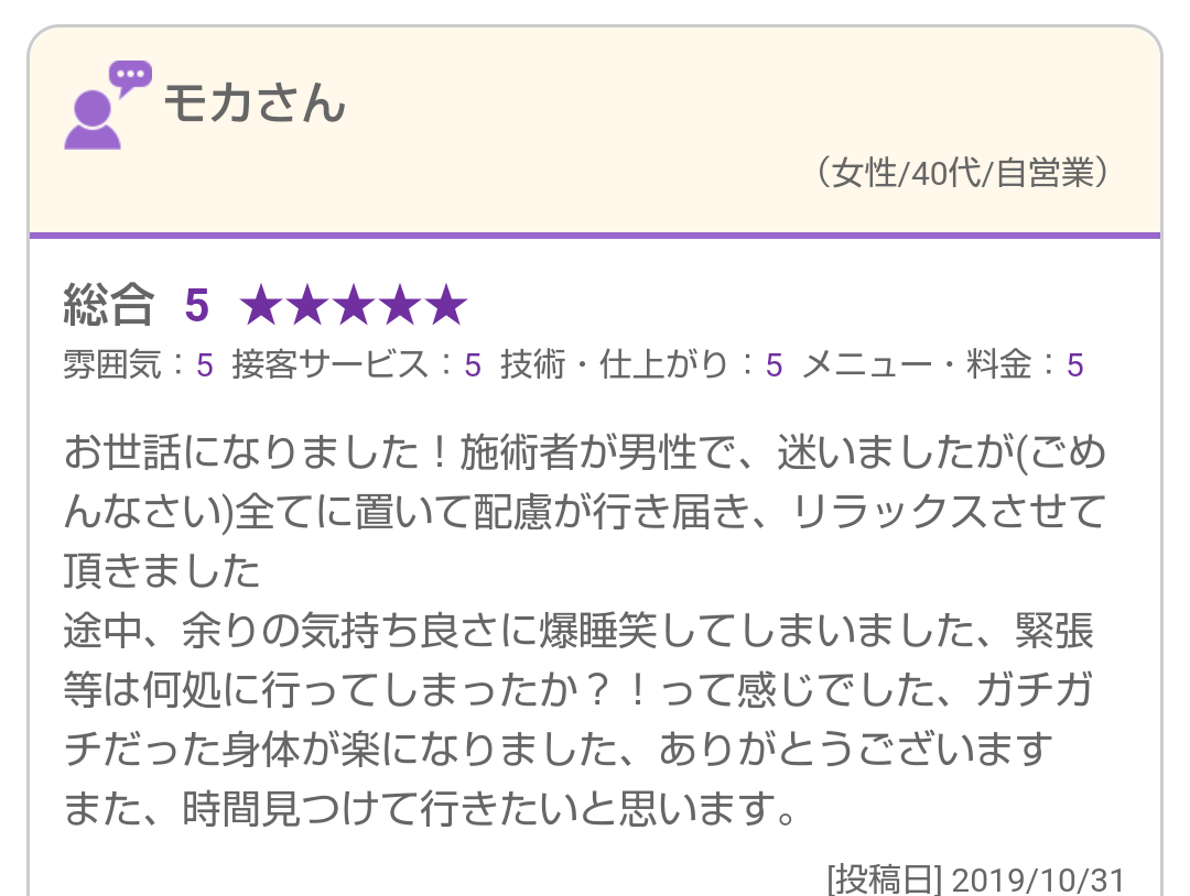 途中、余りの気持ち良さに爆睡笑してしまいました、緊張等は何処に行ってしまったか?!って感じでした、ガチガチだった身体が楽になりました、ありがとうございます