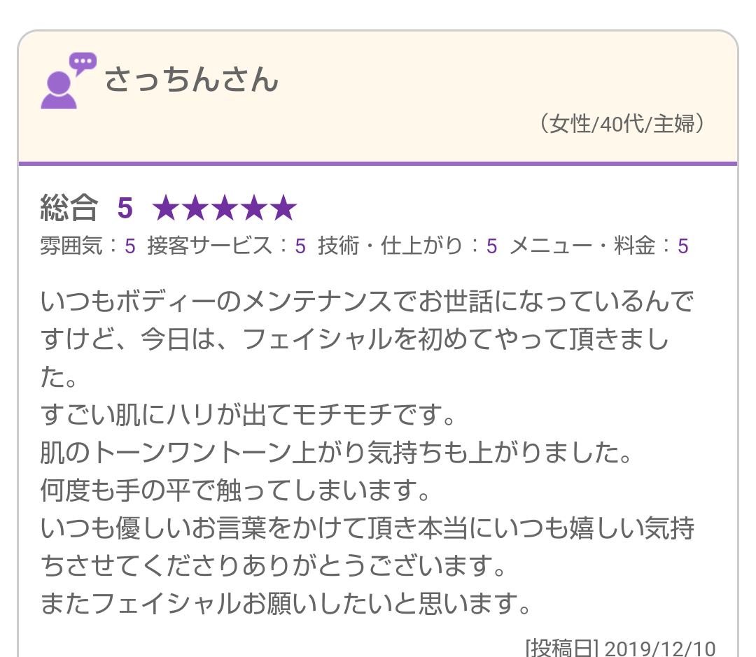 いつもボディーのメンテナンスでお世話になっているんですけど、今日は、フェイシャルを初めてやって頂きました。
