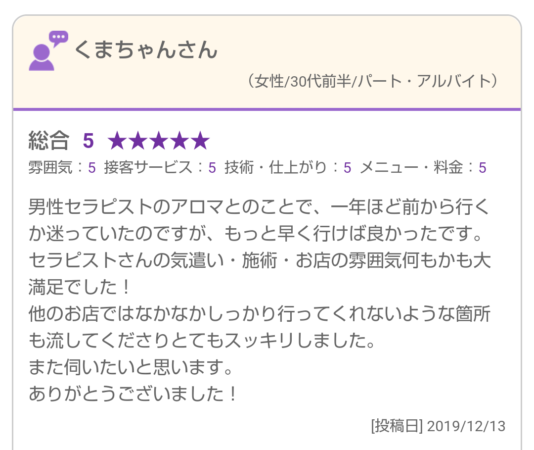 セラピストさんの気遣い・施術・お店の雰囲気何もかも大満足でした!