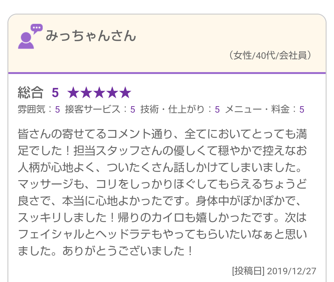 マッサージも、コリをしっかりほぐしてもらえるちょうど良さで、本当に心地よかったです。