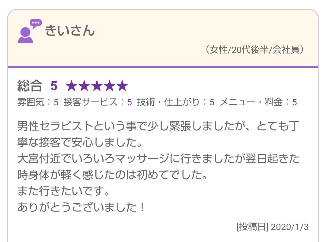 男性セラピストという事で少し緊張しましたが、とても丁寧な接客で安心しました。