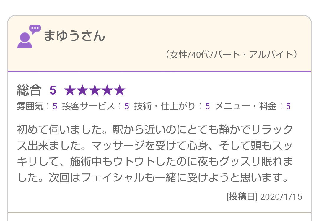 マッサージを受けて心身、そして頭もスッキリして、施術中もウトウトしたのに夜もグッスリ眠れました。