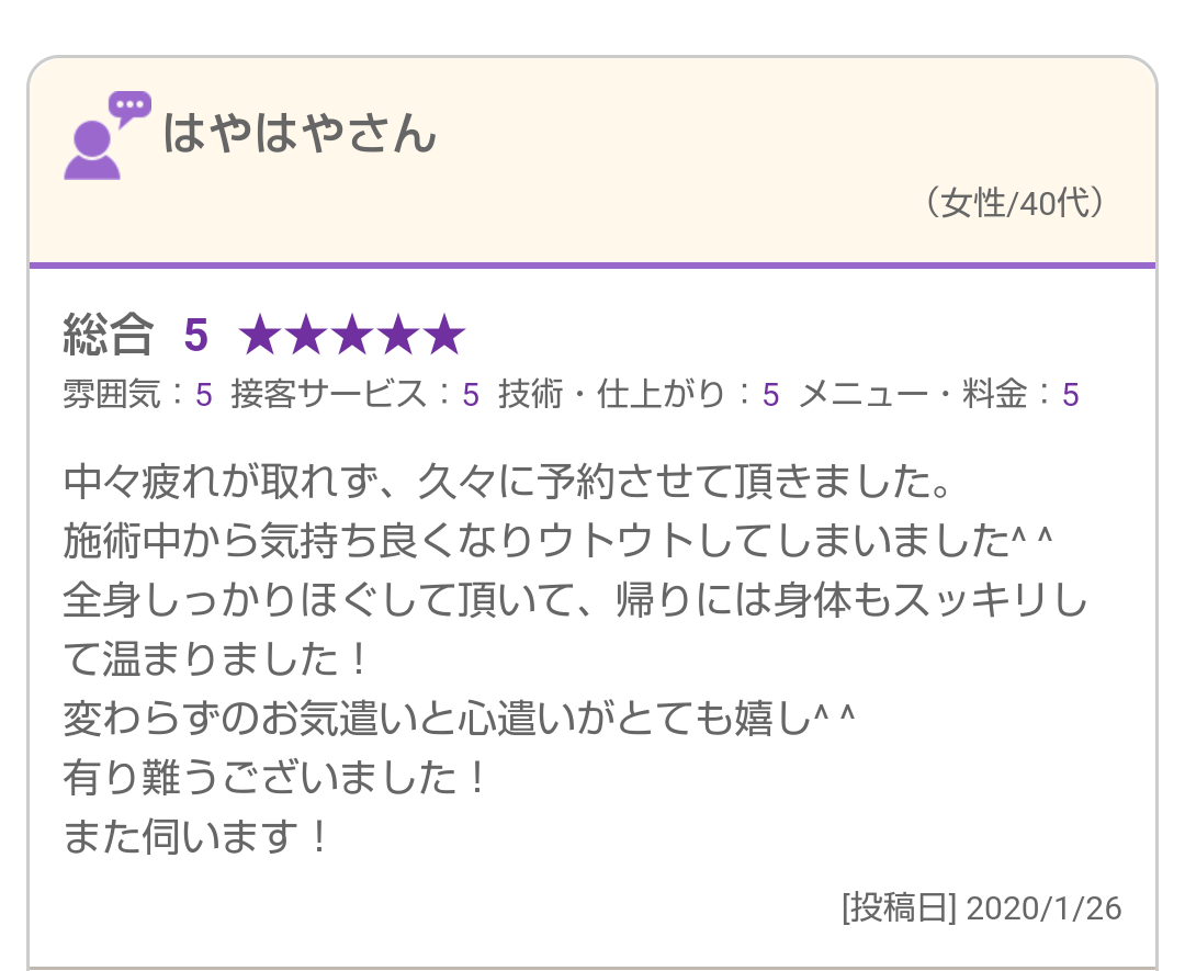 全身しっかりほぐして頂いて、帰りには身体もスッキリして温まりました!
