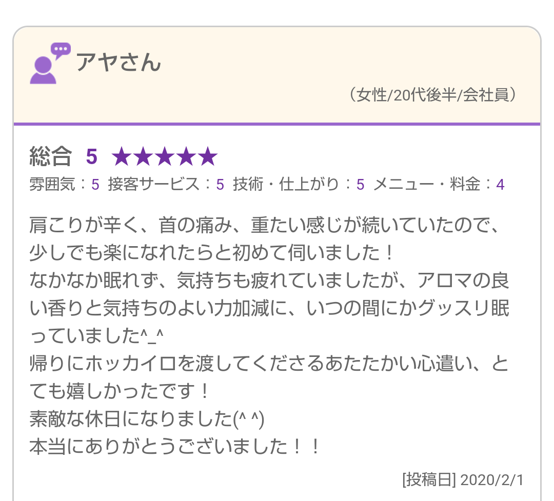 なかなか眠れず、気持ちも疲れていましたが、アロマの良い香りと気持ちのよい力加減に、いつの間にかグッスリ眠っていました^_^