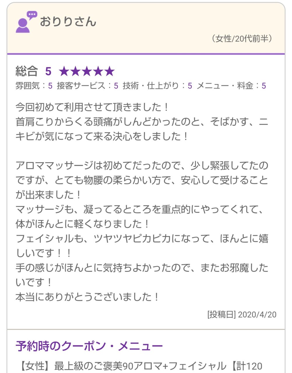 アロママッサージは初めてだったので、少し緊張してたのですが、とても物腰の柔らかい方で、安心して受けることが出来ました!