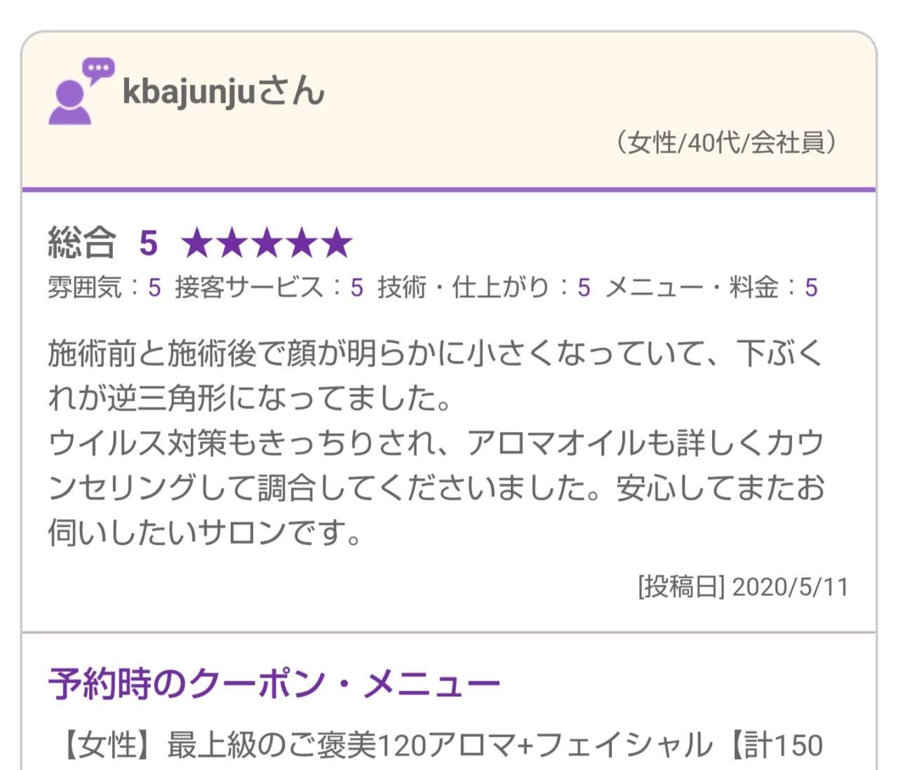 アロマリンパマッサージ&フェイシャルを受けて頂いたお客様の口コミを紹介させて頂きます(^^)