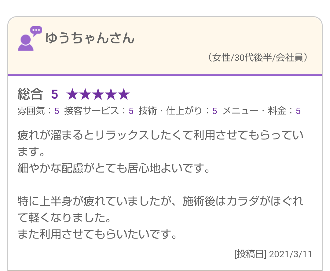 疲れが溜まるとリラックスしたくて利用させてもらっています。