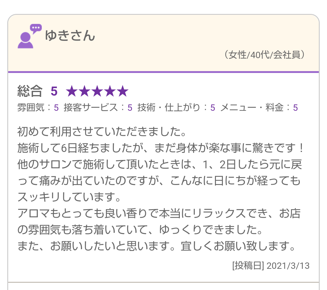 他のサロンで施術して頂いたときは、1、2日したら元に戻って痛みが出ていたのですが、こんなに日にちが経ってもスッキリしています。