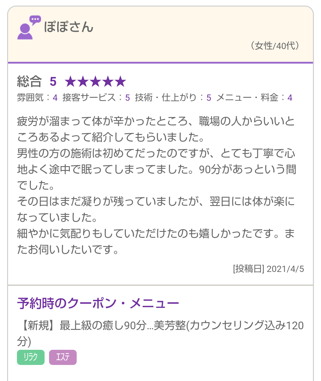男性の方の施術は初めてだったのですが、とても丁寧で心地よく途中で眠ってしまってました。