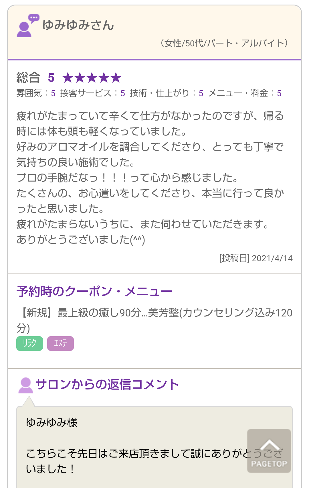 好みのアロマオイルを調合してくださり、とっても丁寧で気持ちの良い施術でした。