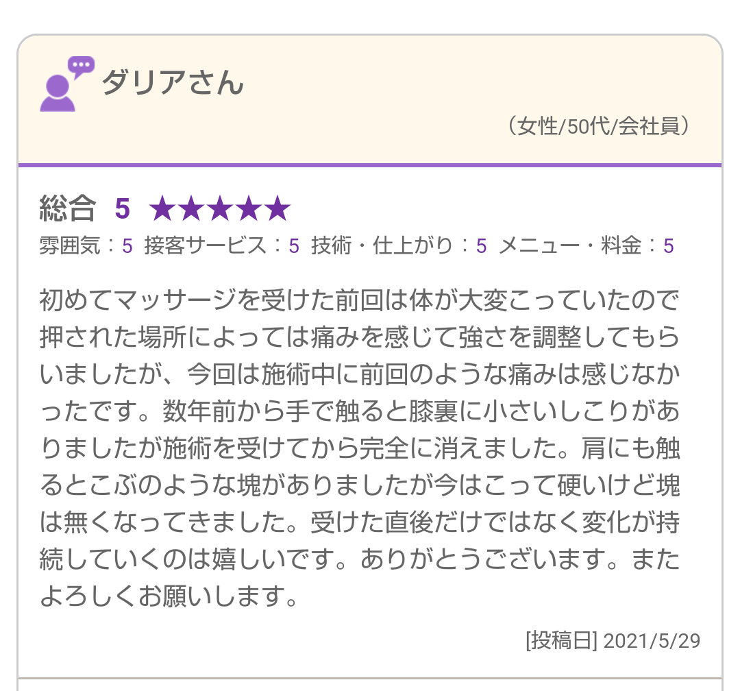 数年前から手で触ると膝裏に小さいしこりがありましたが施術を受けてから完全に消えました。
