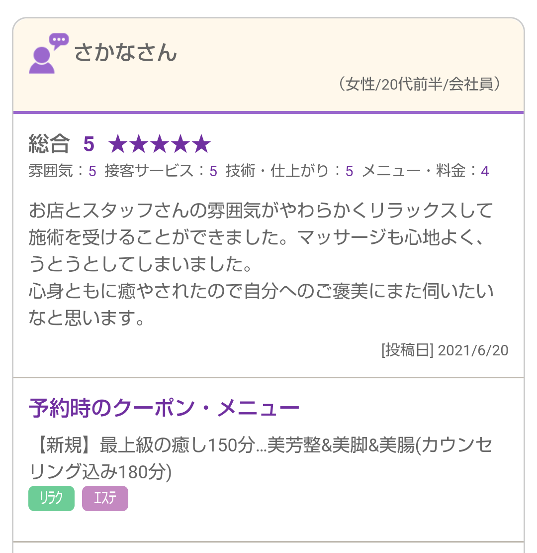 心身ともに癒やされたので自分へのご褒美にまた伺いたいなと思います。