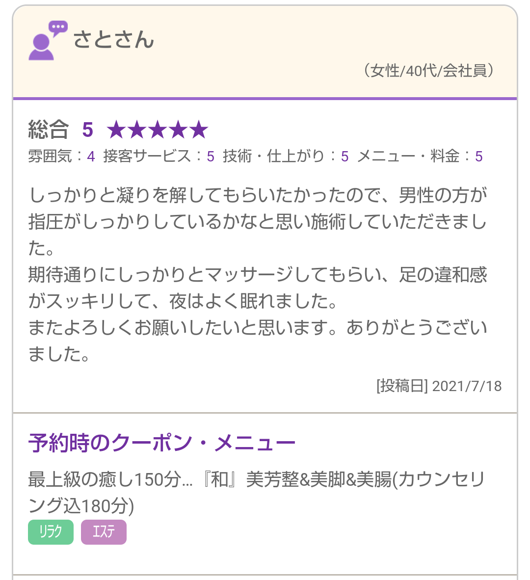 期待通りにしっかりとマッサージしてもらい、足の違和感がスッキリして、夜はよく眠れました。