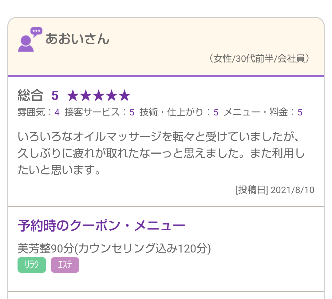 いろいろなオイルマッサージを転々と受けていましたが、久しぶりに疲れが取れたなーっと思えました。また利用したいと思います。