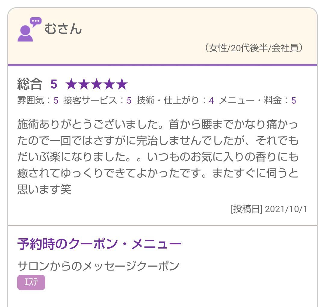 施術ありがとうございました。首から腰までかなり痛かったので一回ではさすがに完治しませんでしたが、それでもだいぶ楽になりました。。いつものお気に入りの香りにも癒されてゆっくりできてよかったです。またすぐに伺うと思います笑