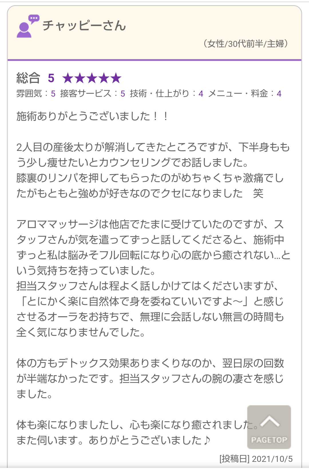 美容整体アロマリンパマッサージを受けて頂いたお客様の口コミを紹介させて頂きます(^^)