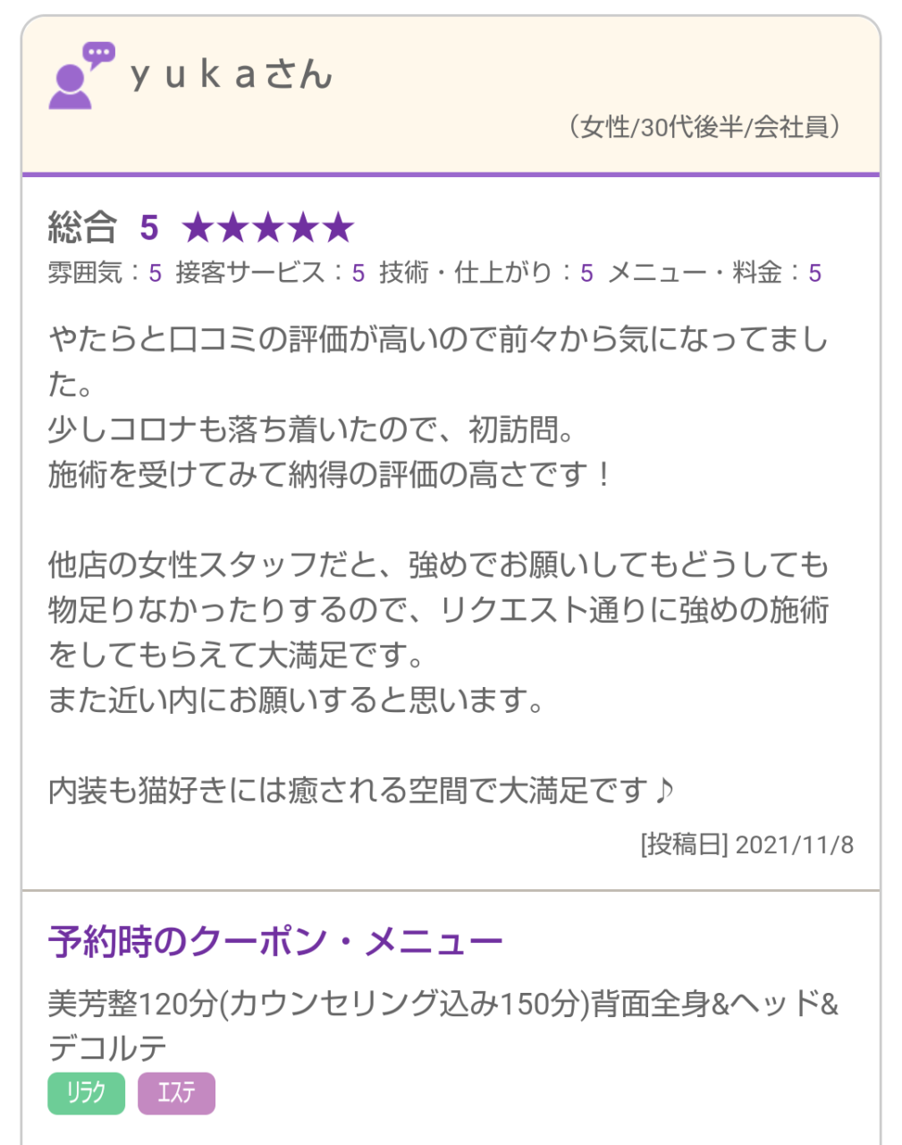 他店の女性スタッフだと、強めでお願いしてもどうしても物足りなかったりするので、リクエスト通りに強めの施術をしてもらえて大満足です。