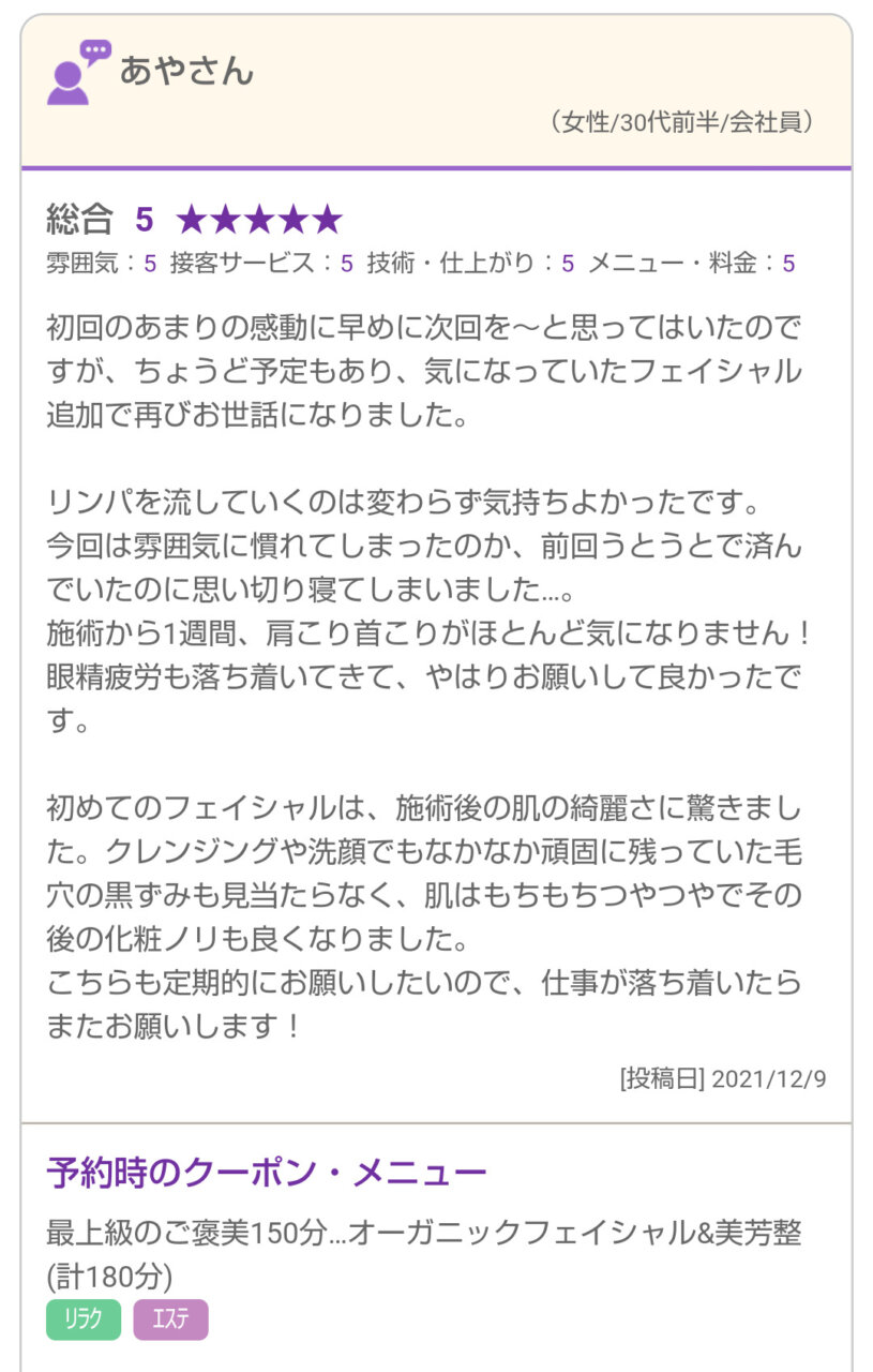 美容整体アロマリンパマッサージを受けて頂いたお客様の口コミを紹介させて頂きます(^^)