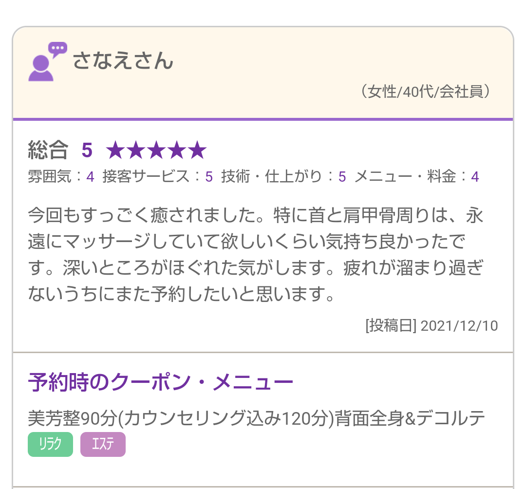 疲れが溜まり過ぎないうちにまた予約したいと思います。