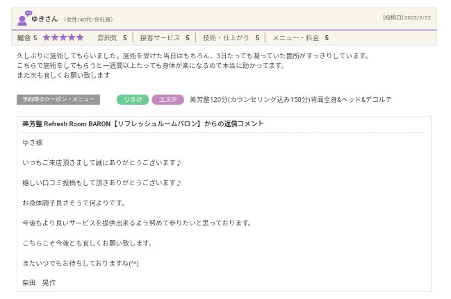 美芳整 Refresh Room BARON【リフレッシュルームバロン】からの返信コメント