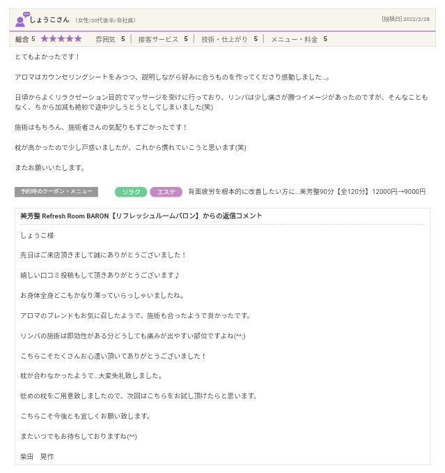 美芳整 Refresh Room BARON【リフレッシュルームバロン】からの返信コメント