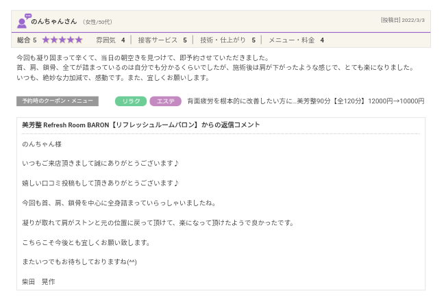 美芳整 Refresh Room BARON【リフレッシュルームバロン】からの返信コメント