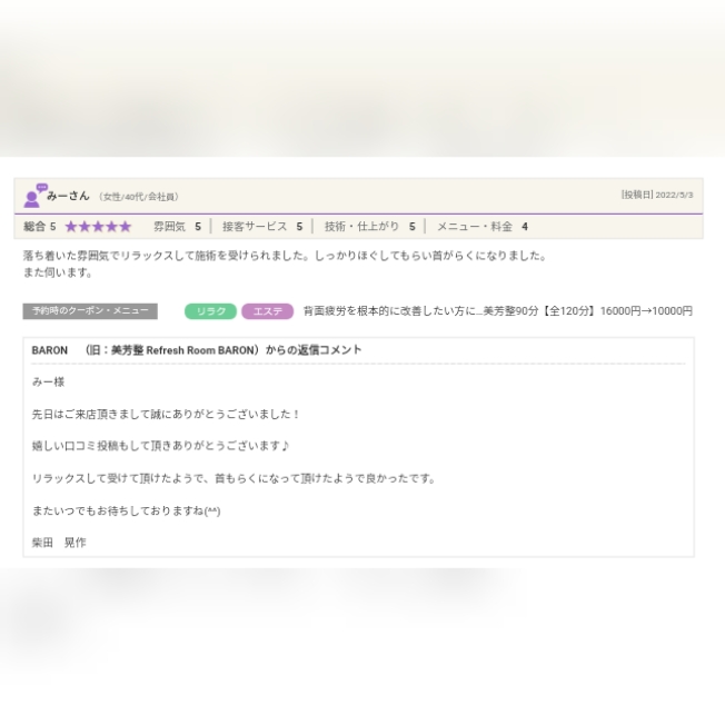 BARON (旧:美芳整 Refresh Room BARON)からの返信コメント