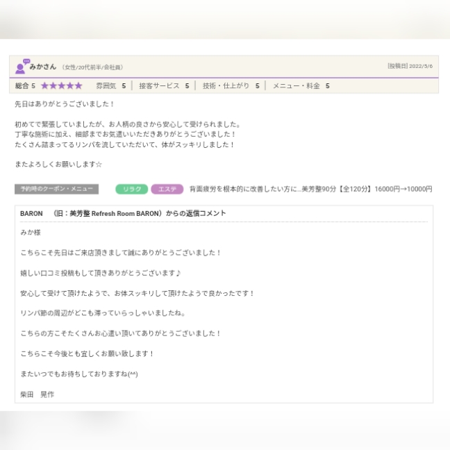 BARON (旧:美芳整 Refresh Room BARON)からの返信コメント
