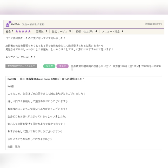 BARON (旧:美芳整 Refresh Room BARON)からの返信コメント