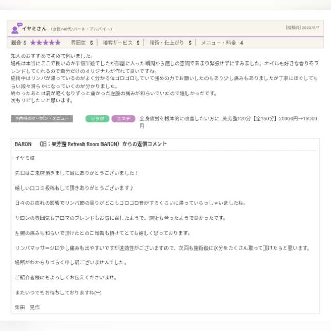BARON (旧:美芳整 Refresh Room BARON)からの返信コメント