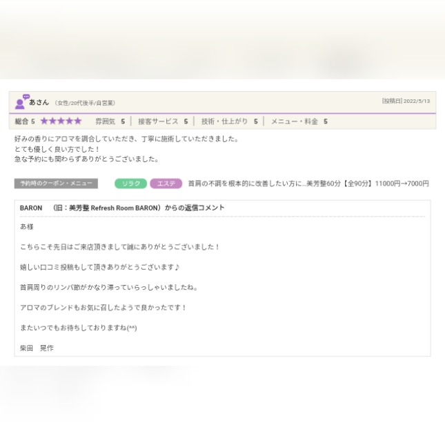 BARON (旧:美芳整 Refresh Room BARON)からの返信コメント