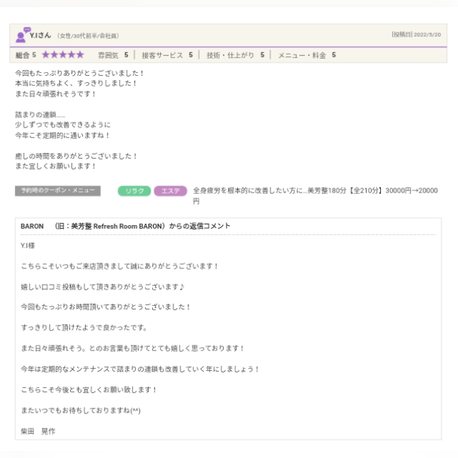 BARON (旧:美芳整 Refresh Room BARON)からの返信コメント