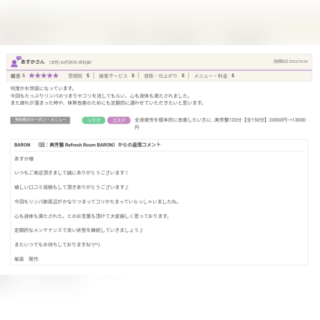 BARON (旧:美芳整 Refresh Room BARON)からの返信コメント