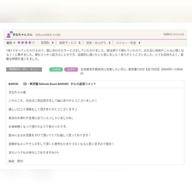 BARON (旧:美芳整 Refresh Room BARON)からの返信コメント