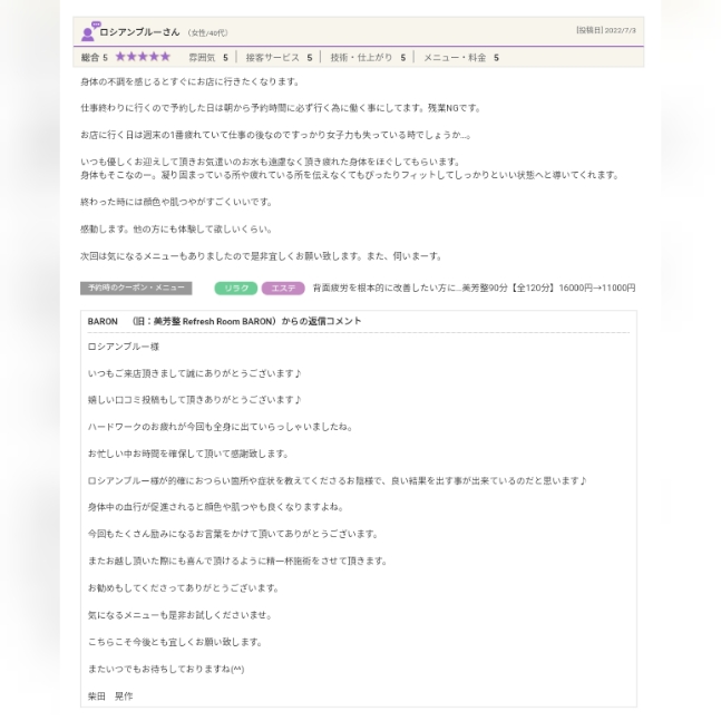 BARON (旧:美芳整 Refresh Room BARON)からの返信コメント