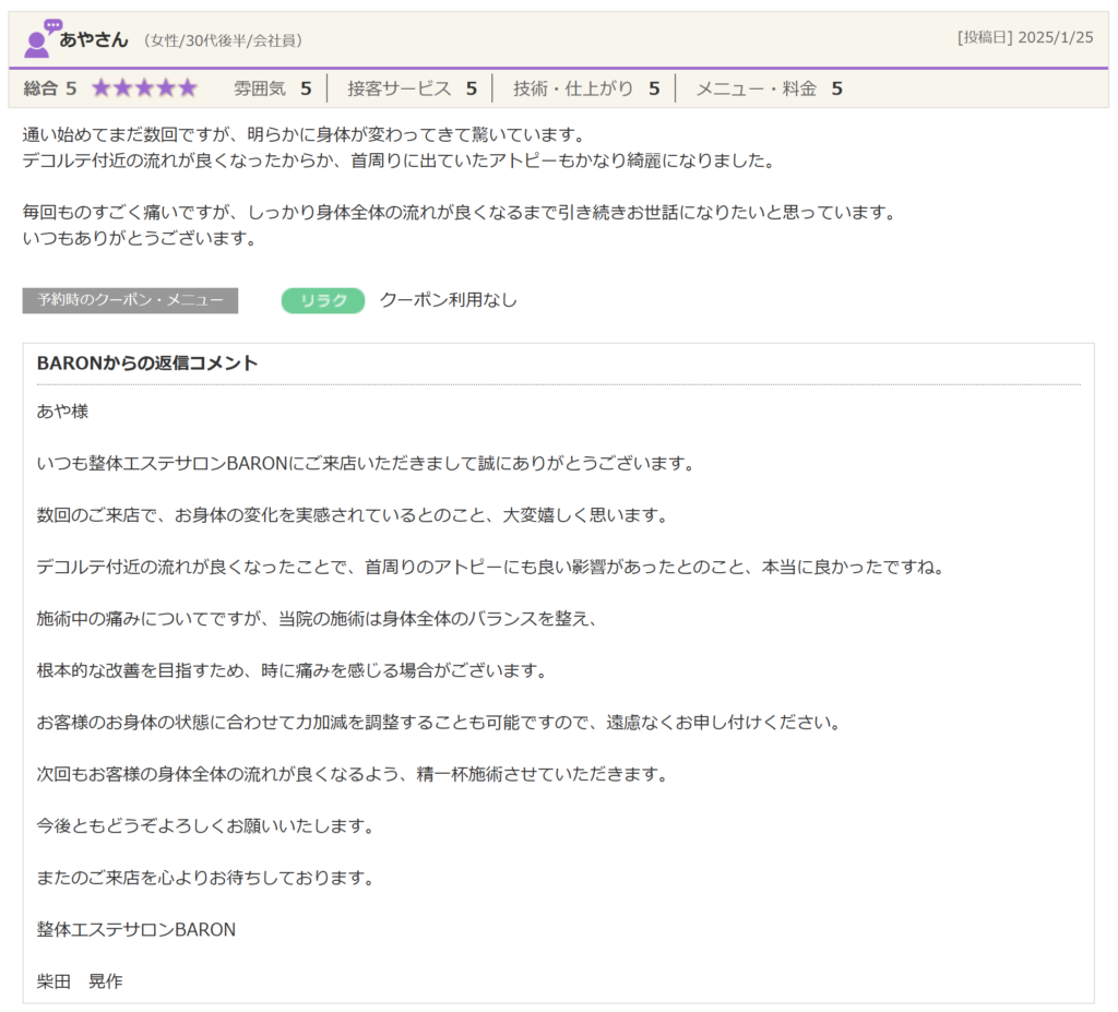 美容整体オイルリンパマッサージを受けて頂いたお客様の口コミを紹介させて頂きます(^^)