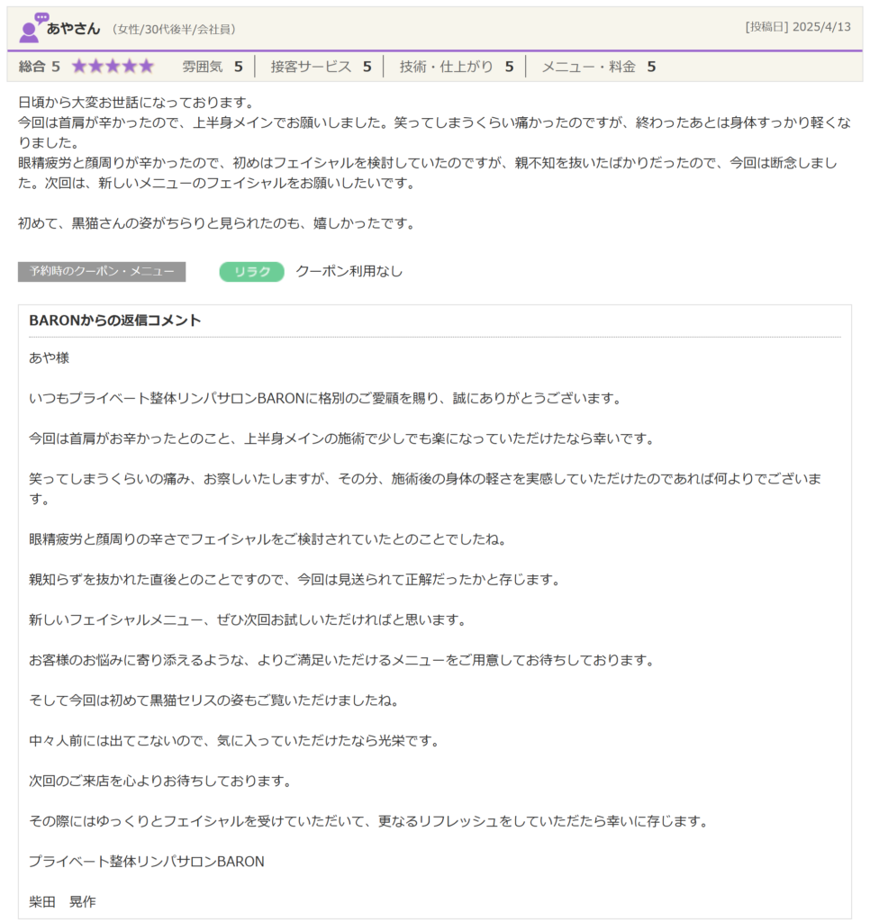 いつもプライベート整体リンパサロンBARONに格別のご愛顧を賜り、誠にありがとうございます。