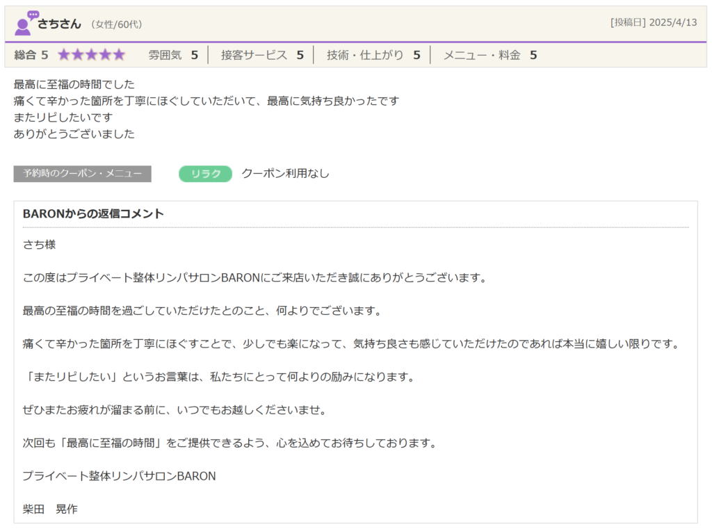 この度はプライベート整体リンパサロンBARONにご来店いただき誠にありがとうございます。