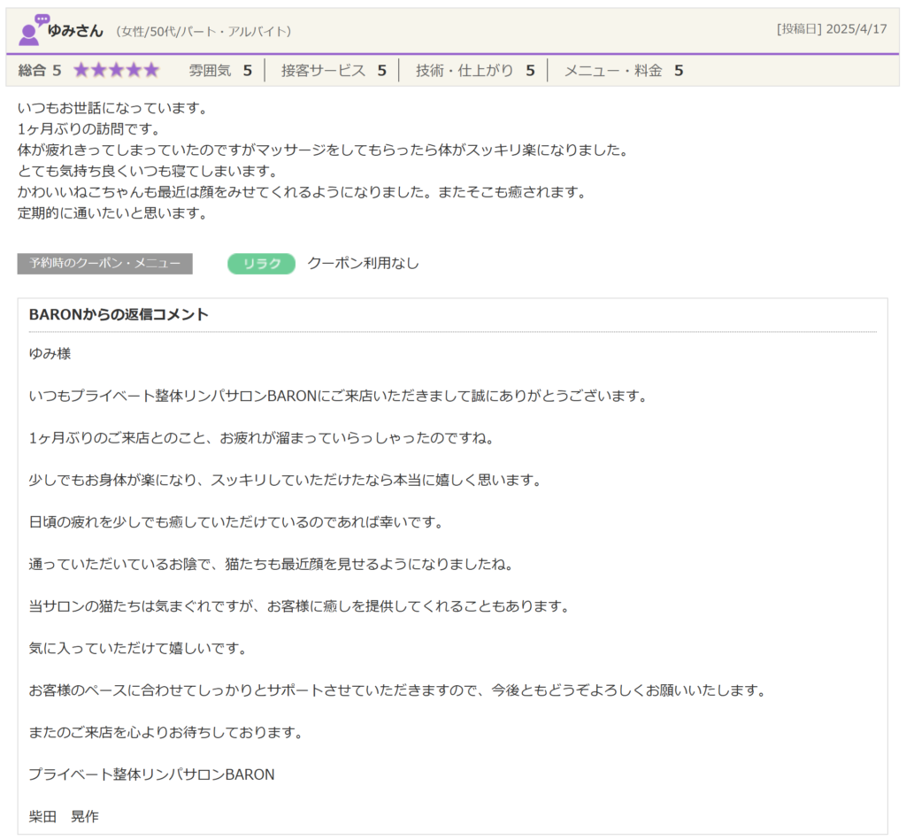 いつもプライベート整体リンパサロンBARONにご来店いただきまして誠にありがとうございます。