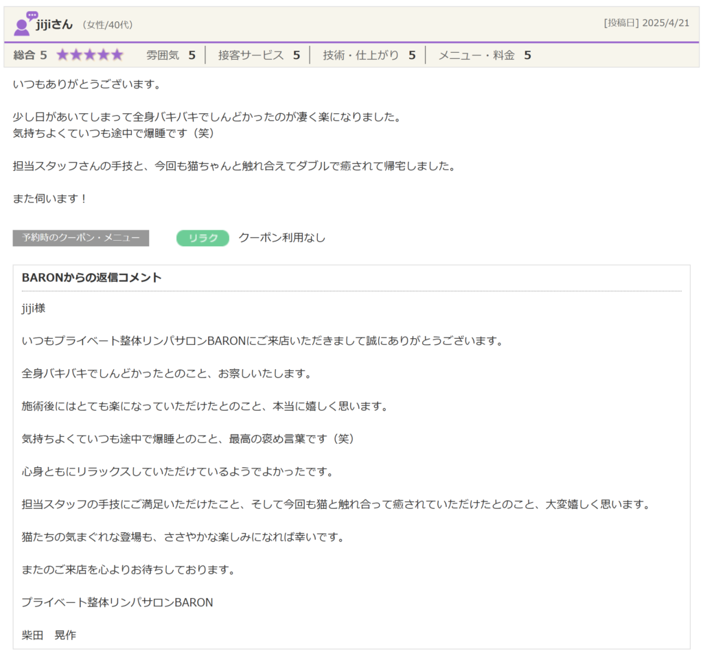 担当スタッフの手技にご満足いただけたこと、そして今回も猫と触れ合って癒されていただけたとのこと、大変嬉しく思います。