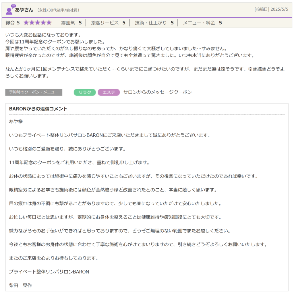 いつもプライベート整体リンパサロンBARONにご来店いただきまして誠にありがとうございます。
